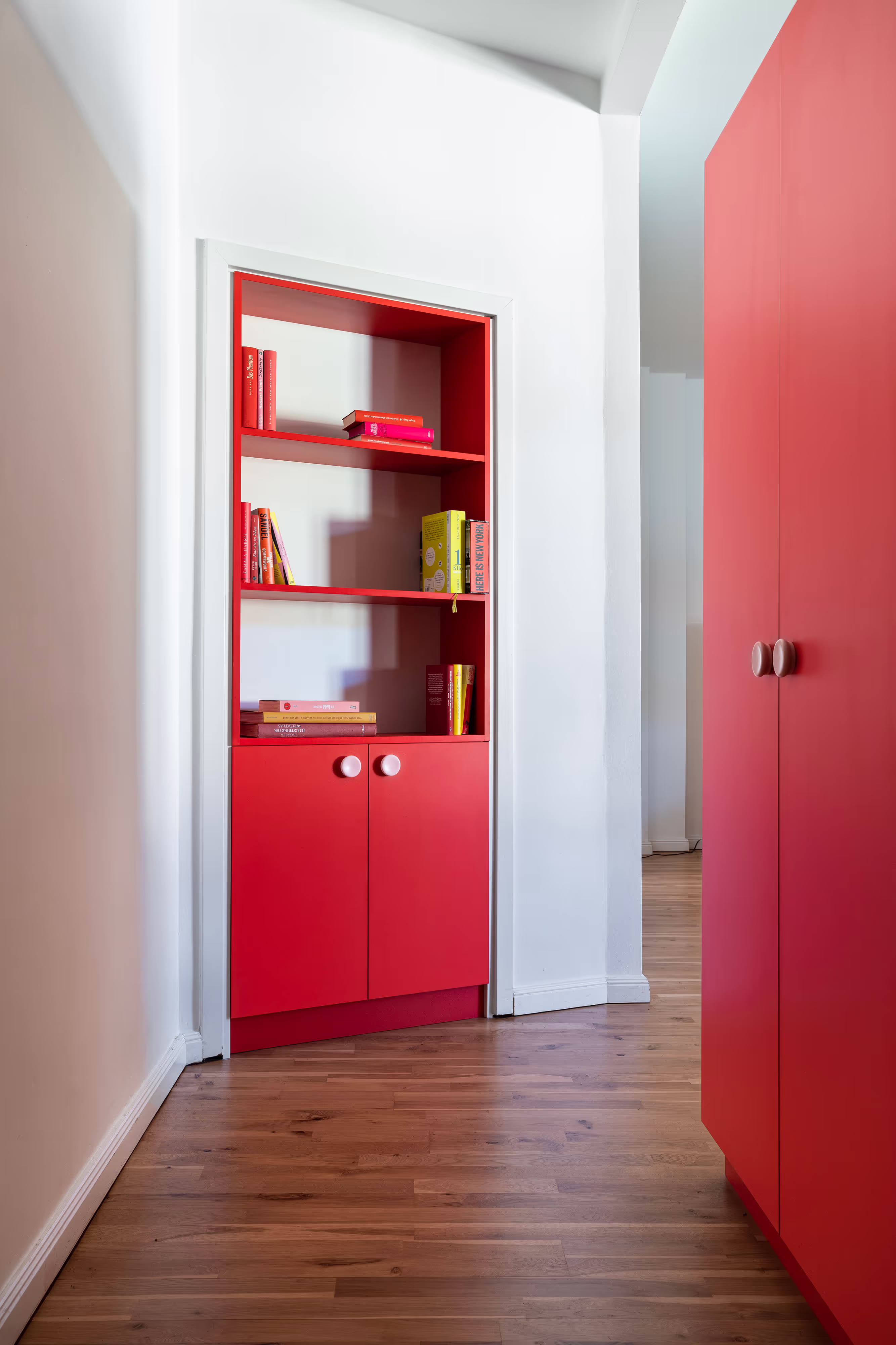 The bold color gives character to the room, and accommodates a lot of storage space from the hallway to the kitchen.