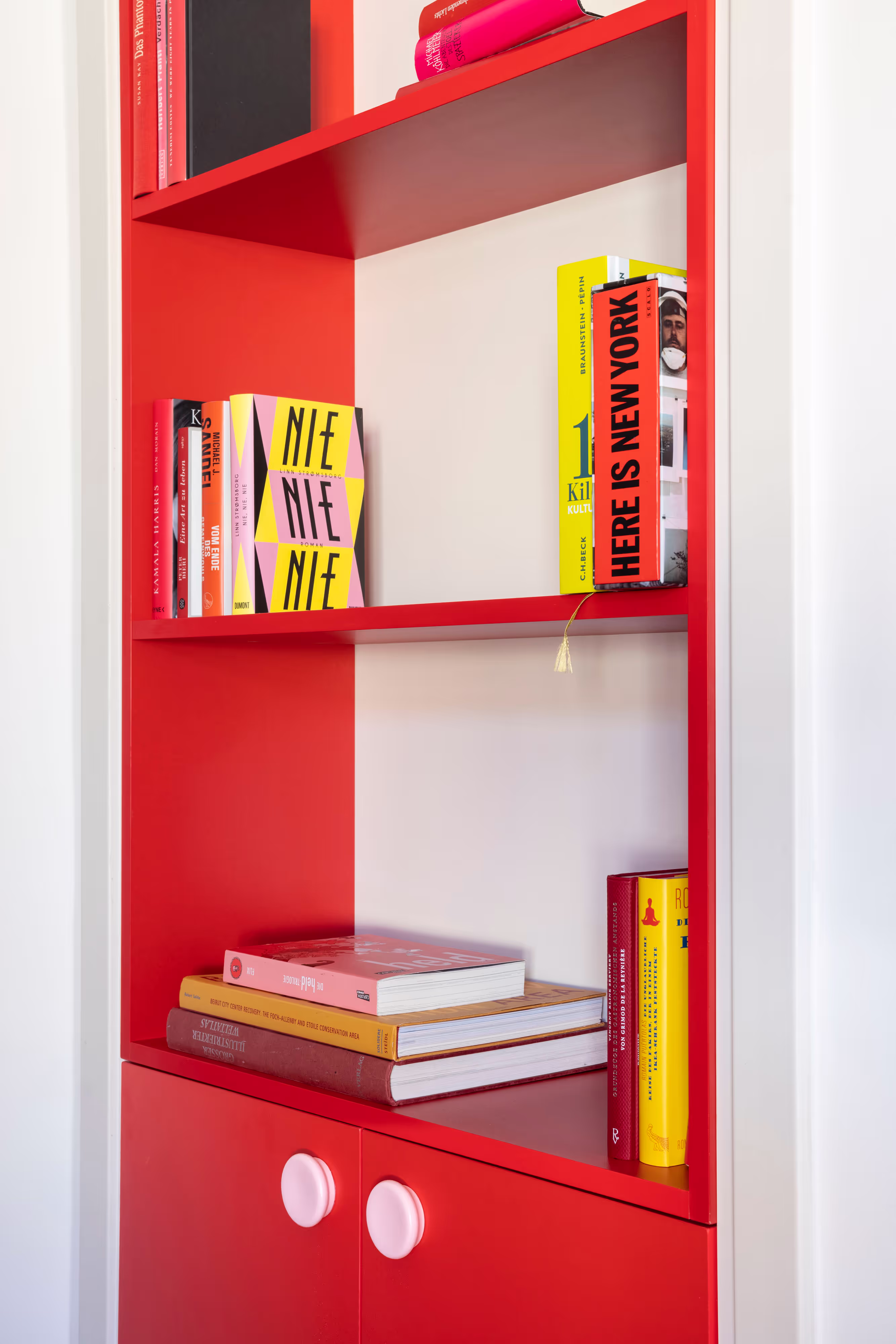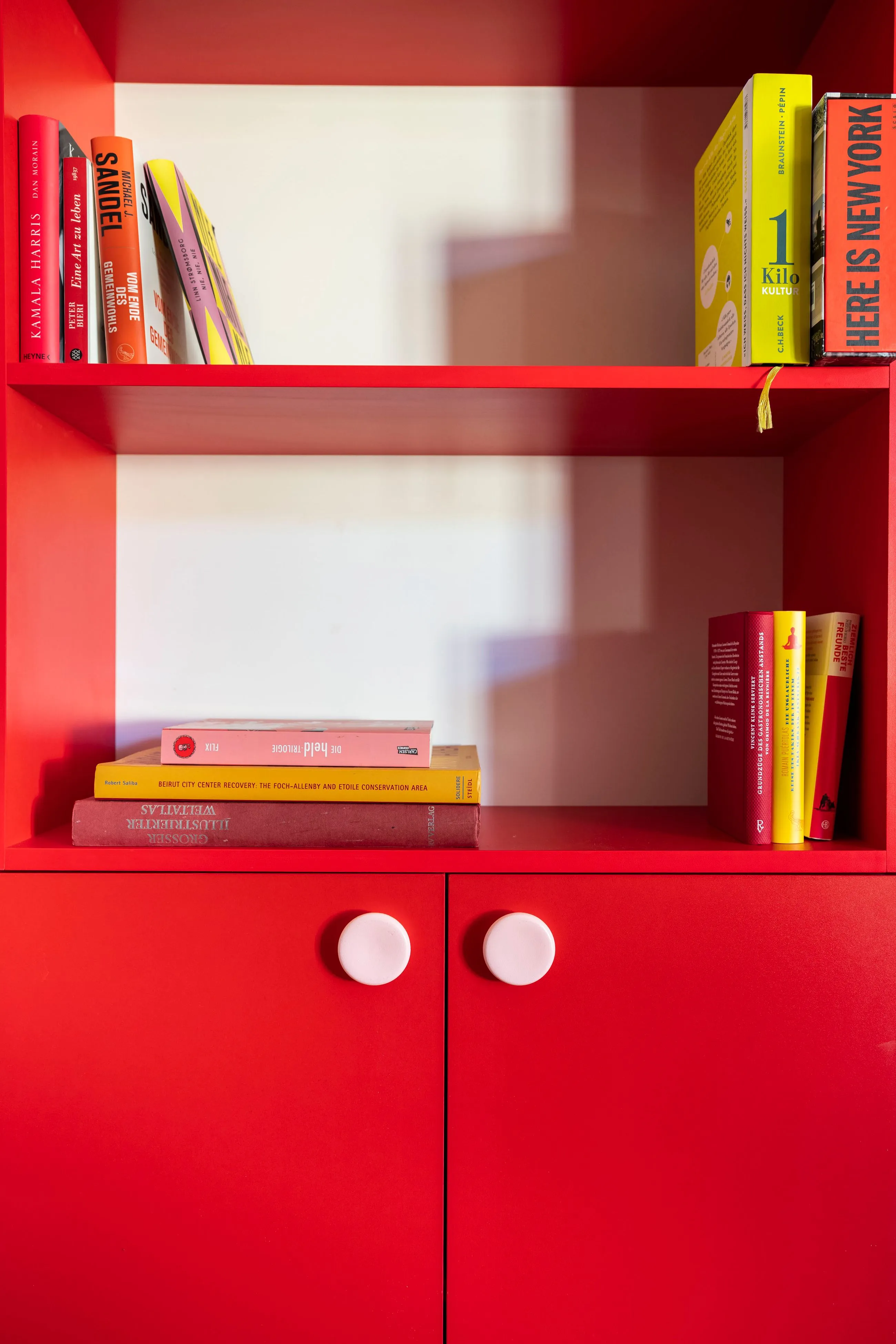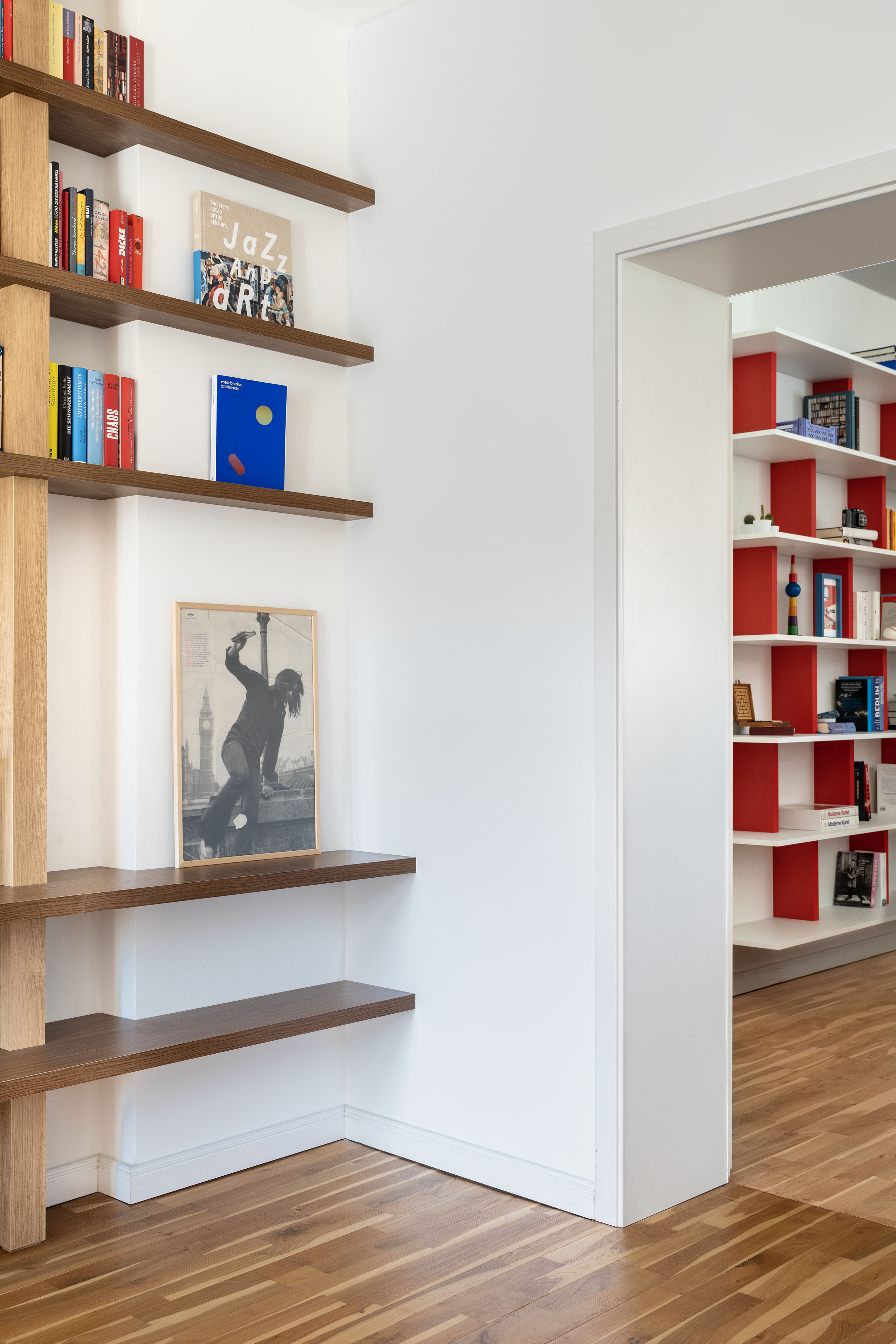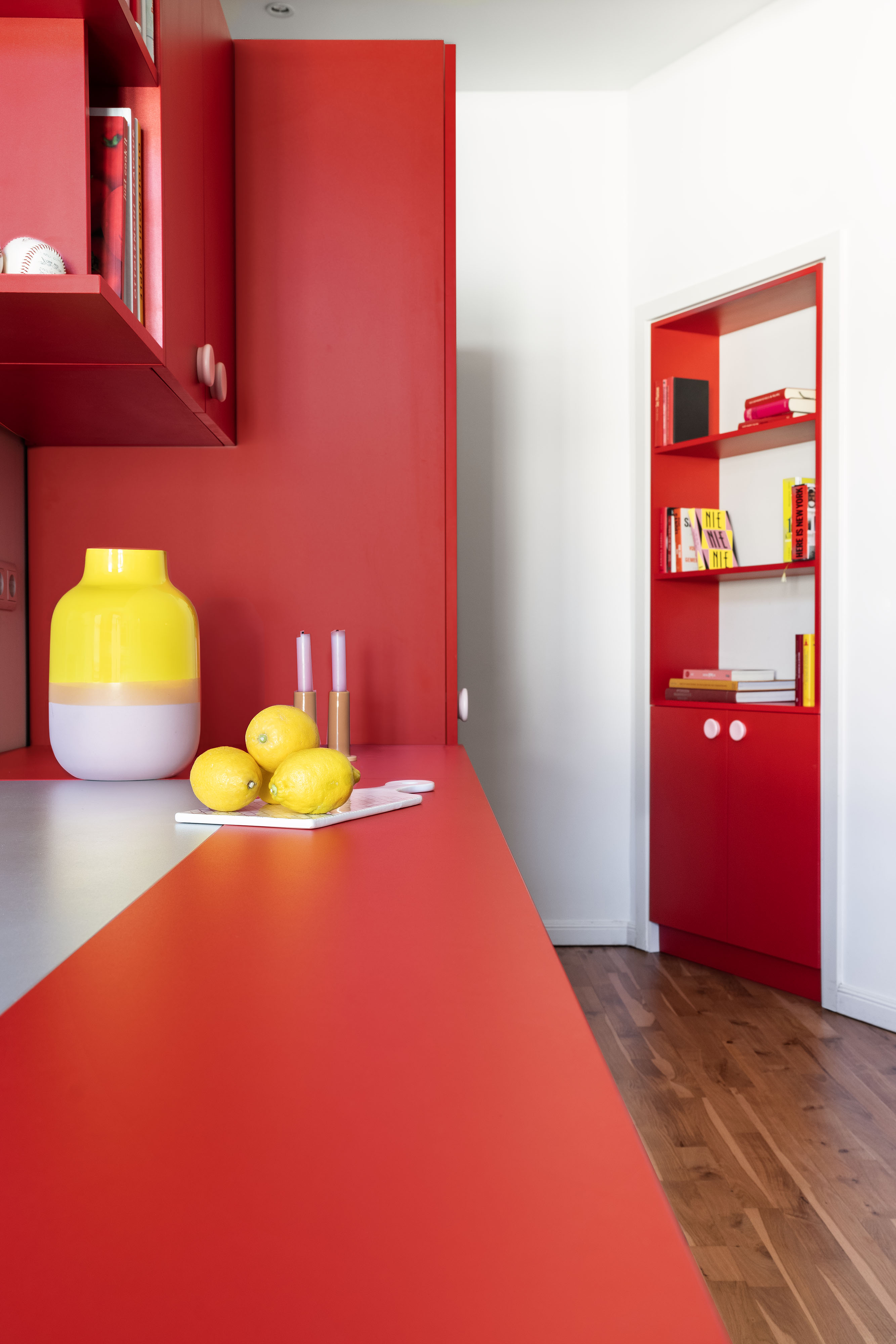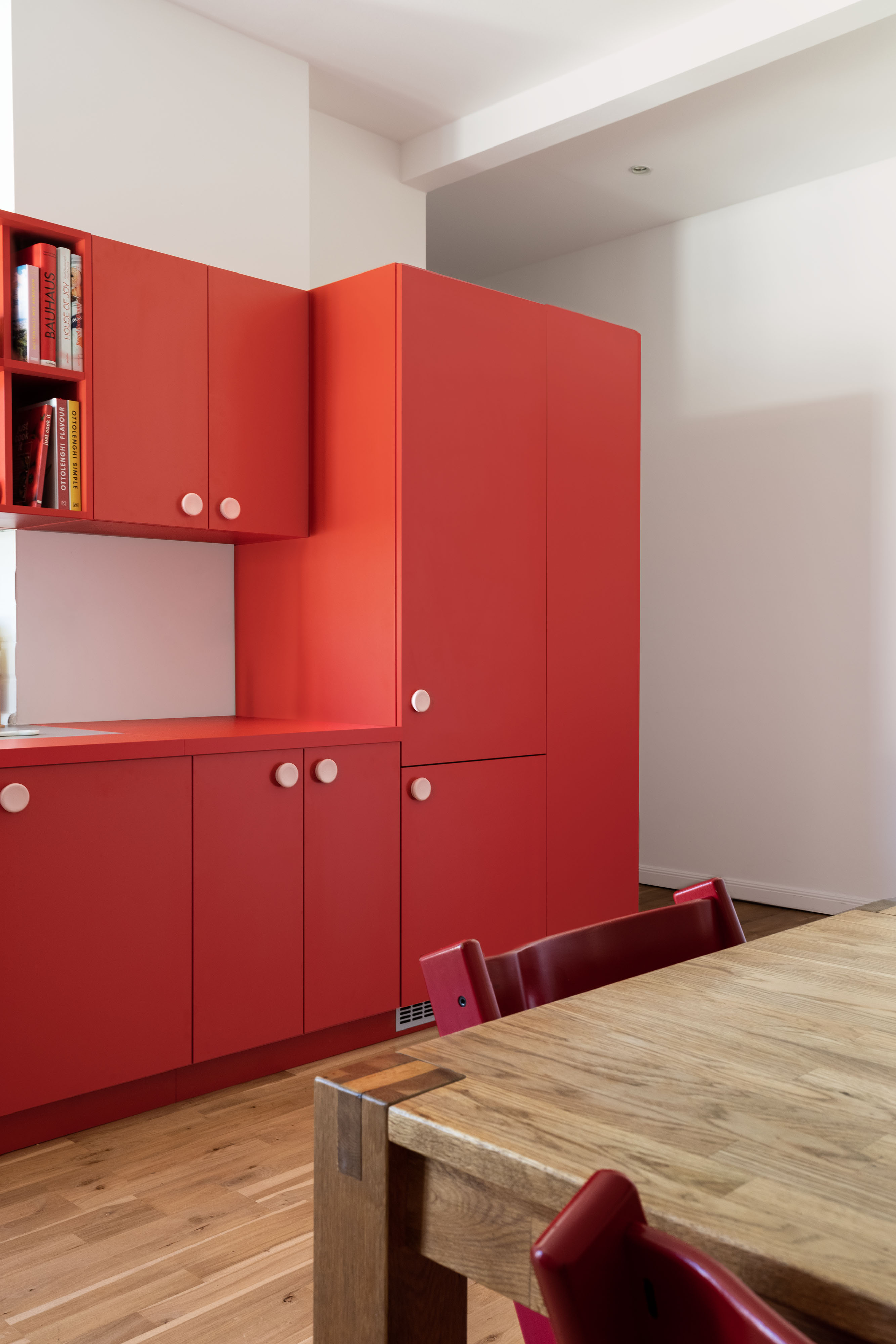 In the entrance and the dining room, we have designed several pieces of library furniture in harmony with the red cube of the kitchen, to connect the different functions of the space, and to host the numerous books present in the apartment.