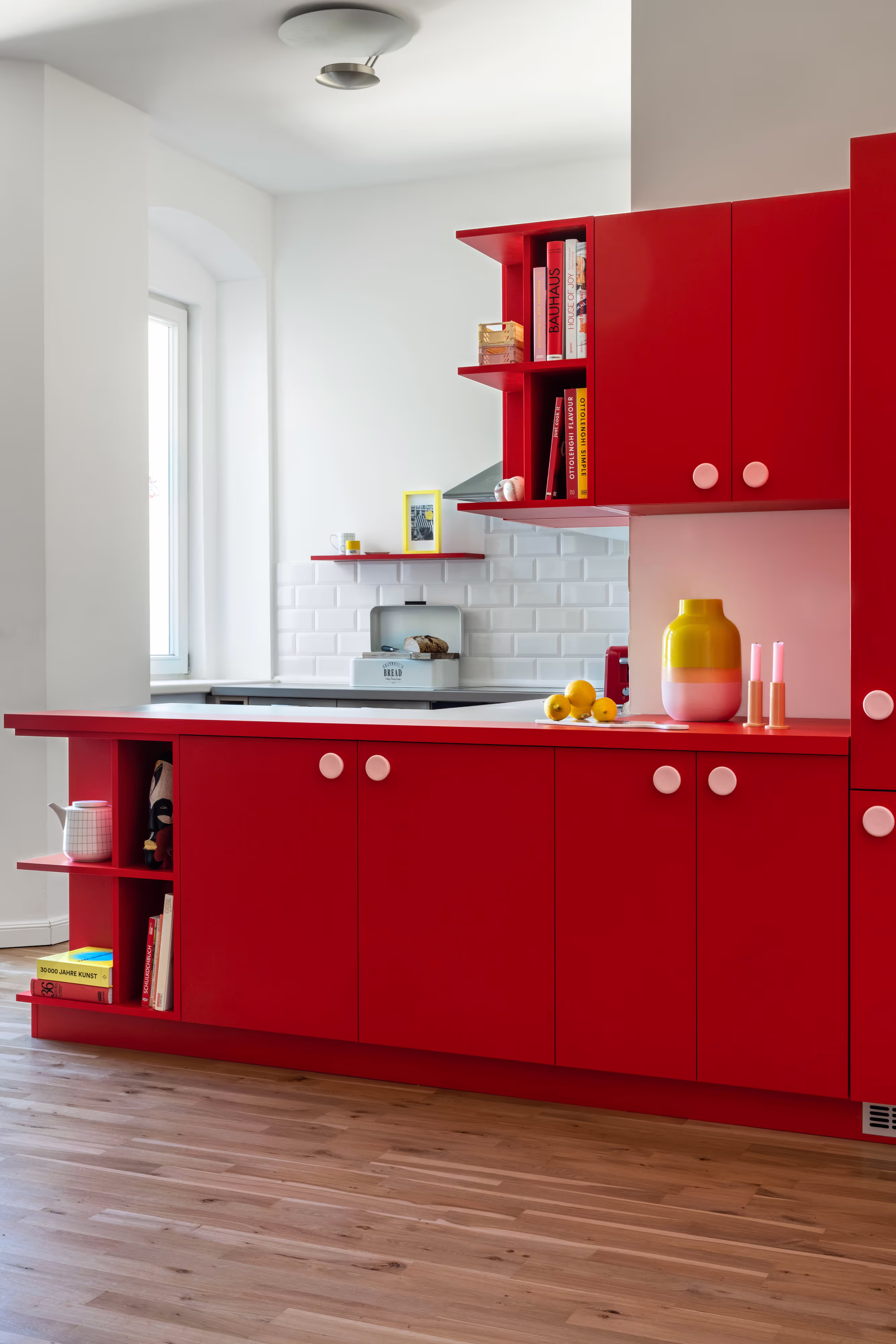 The clients arrived in their new rented apartment with an existing kitchen that was too small and not to their liking. So we built a colorful extension, in the form of a red cube.
