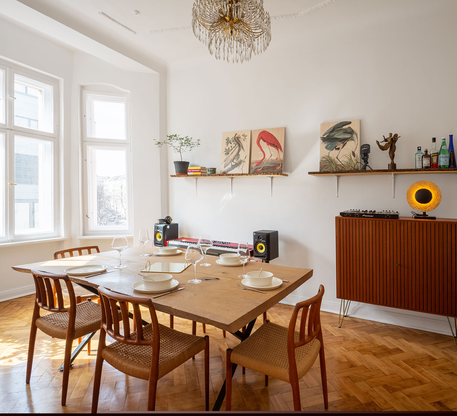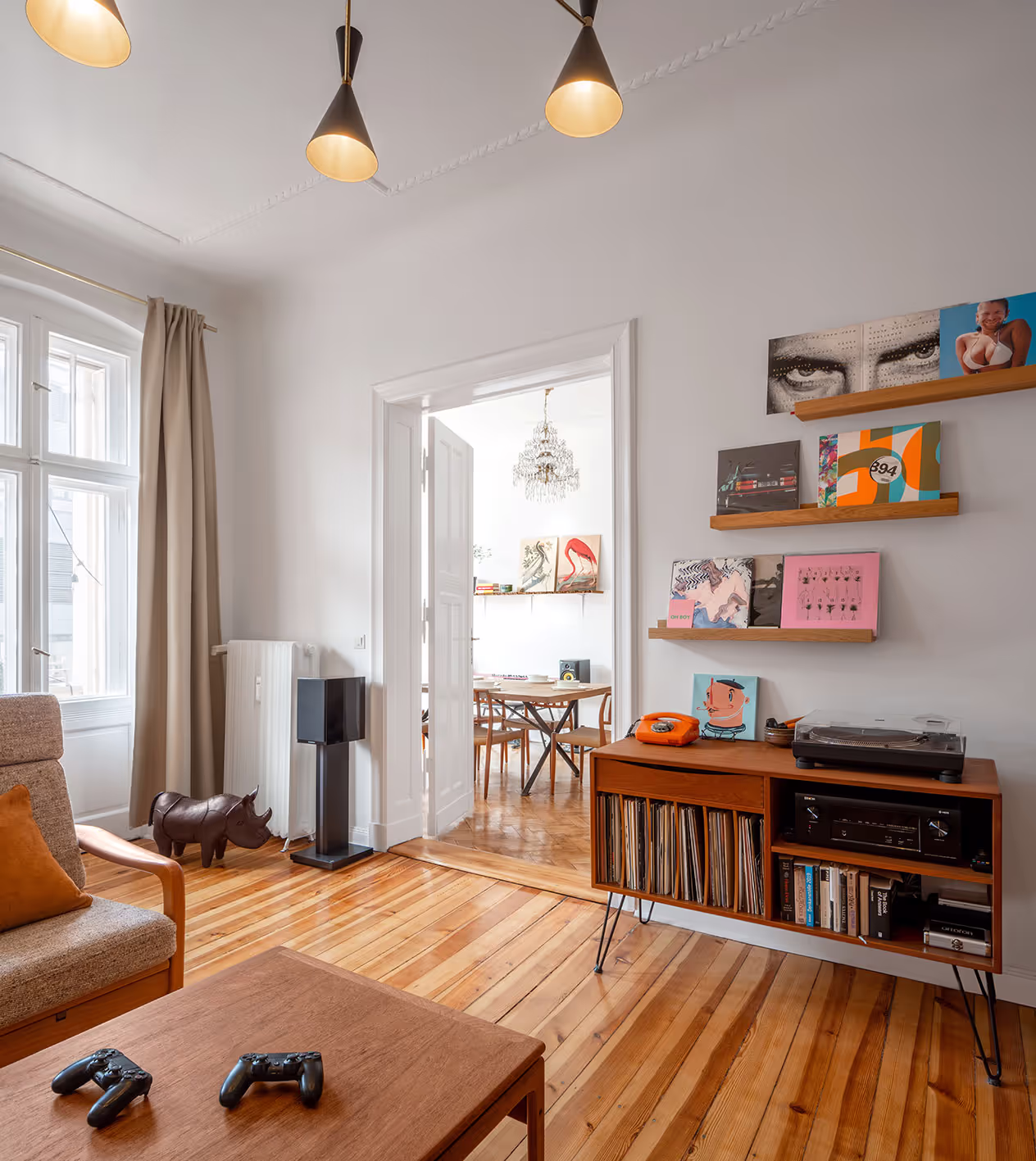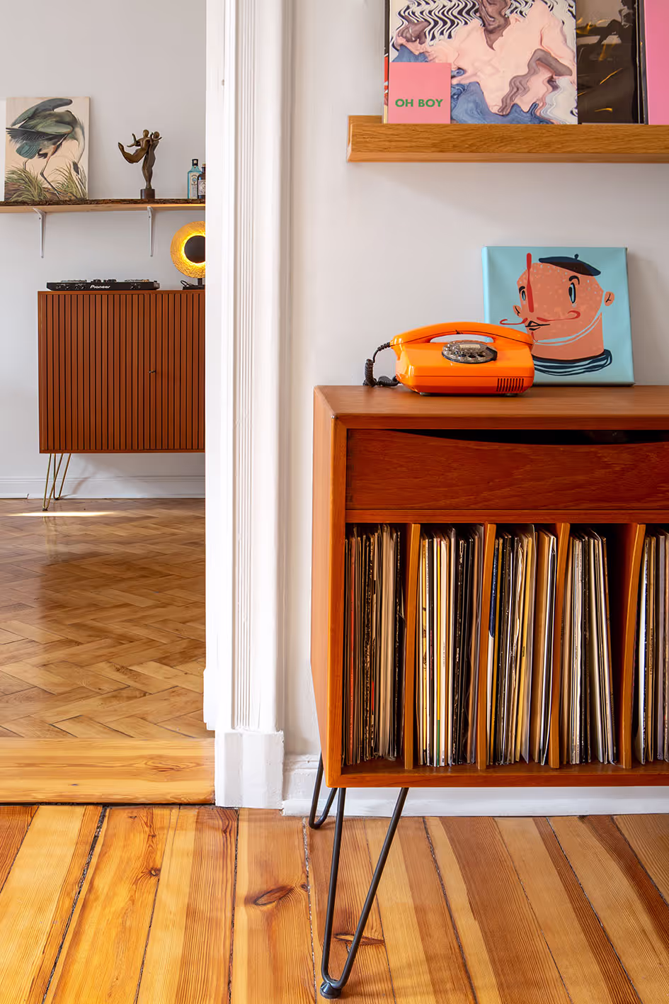 As J&S rent their flat, we could not change the structure of this old Berlin apartment. We decided to leave the walls of all the rooms white, and create a contrast with the furniture and the decoration. They wanted to respect the old character of the place, while having a modern and trendy home. The kitchen is made of black and oak, a compromise between tradition and modernity. Being music fans, their many colored vinyls, musical instruments, or video games bring humor and freshness in this classic apartment.