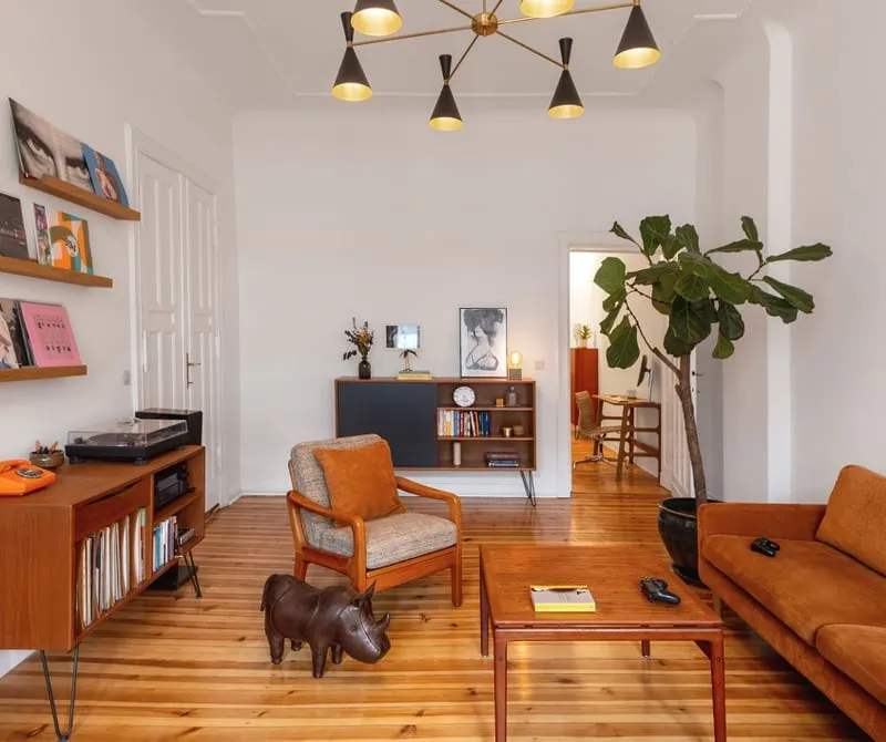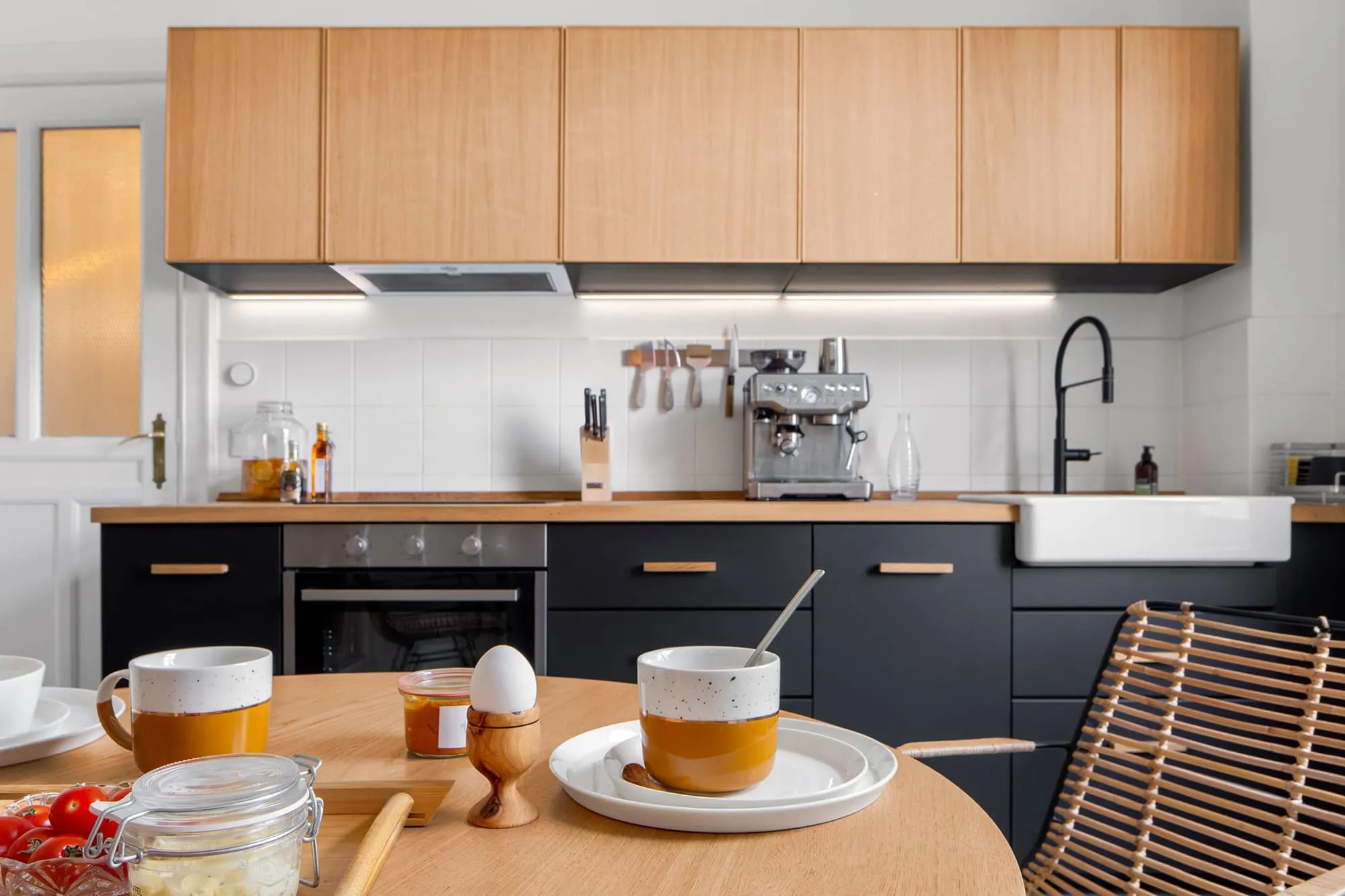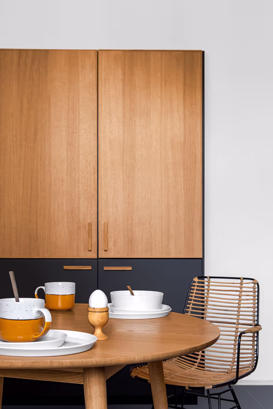 As J&S rent their flat, we could not change the structure of this old Berlin apartment. We decided to leave the walls of all the rooms white, and create a contrast with the furniture and the decoration. They wanted to respect the old character of the place, while having a modern and trendy home. The kitchen is made of black and oak, a compromise between tradition and modernity. Being music fans, their many colored vinyls, musical instruments, or video games bring humor and freshness in this classic apartment.