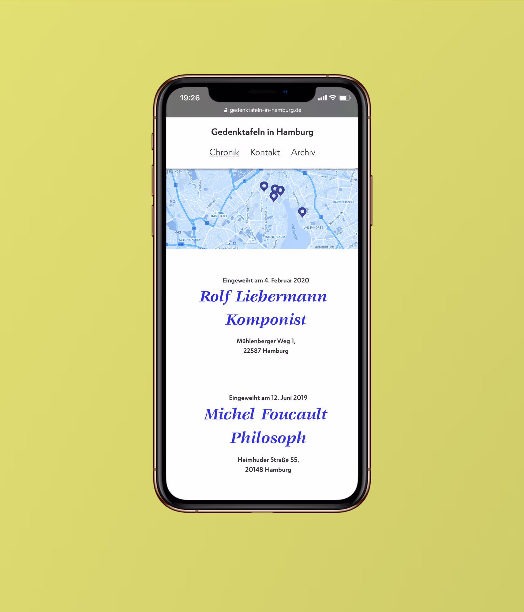 The city of Hamburg is full of history. For Gedenktafeln in Hamburg we created a website with features like a map and archive. If you have the chance to visit Hamburg, make sure to visit the website and find out more about the artist who lived there and shaped the area you're visiting.