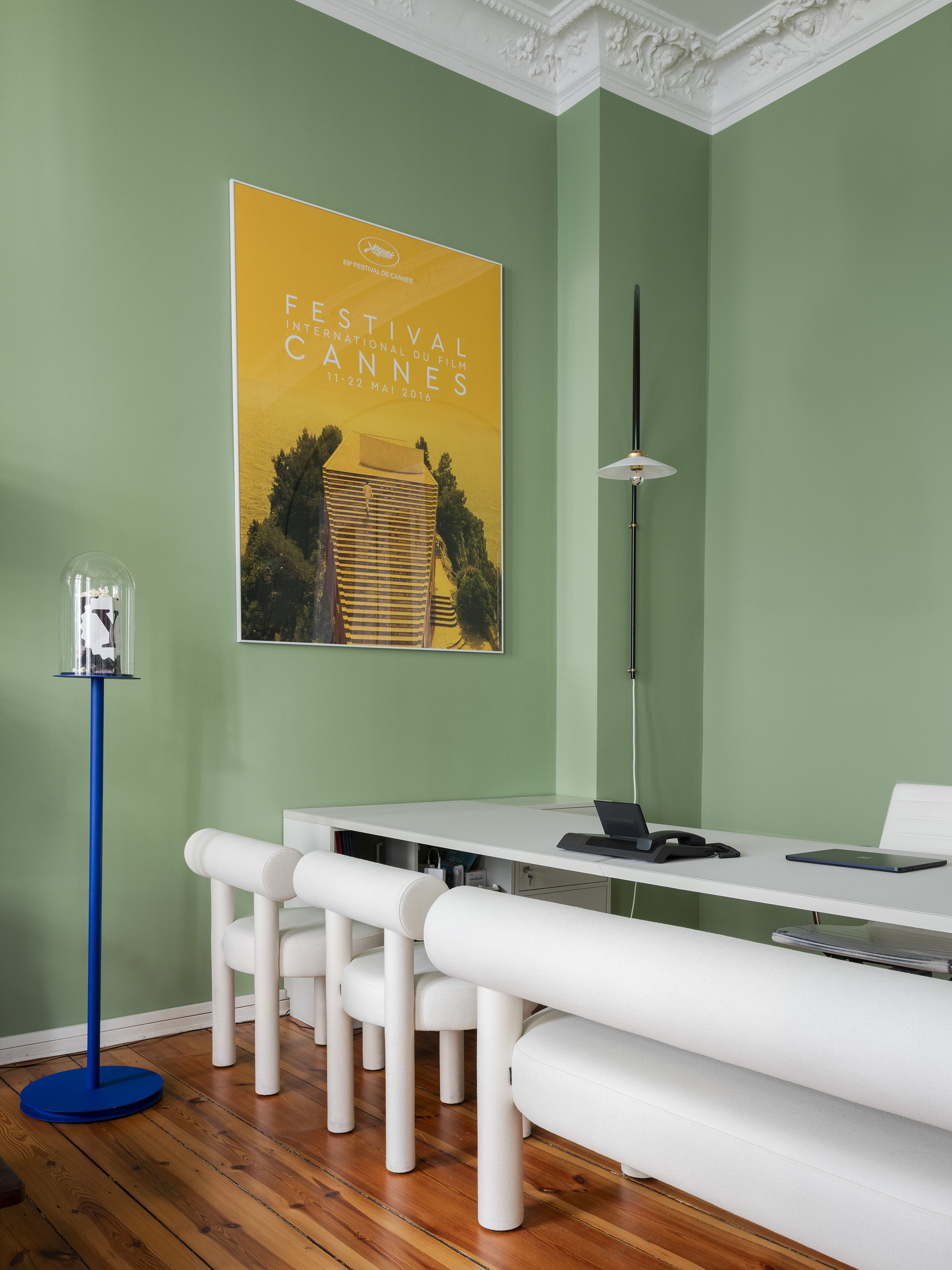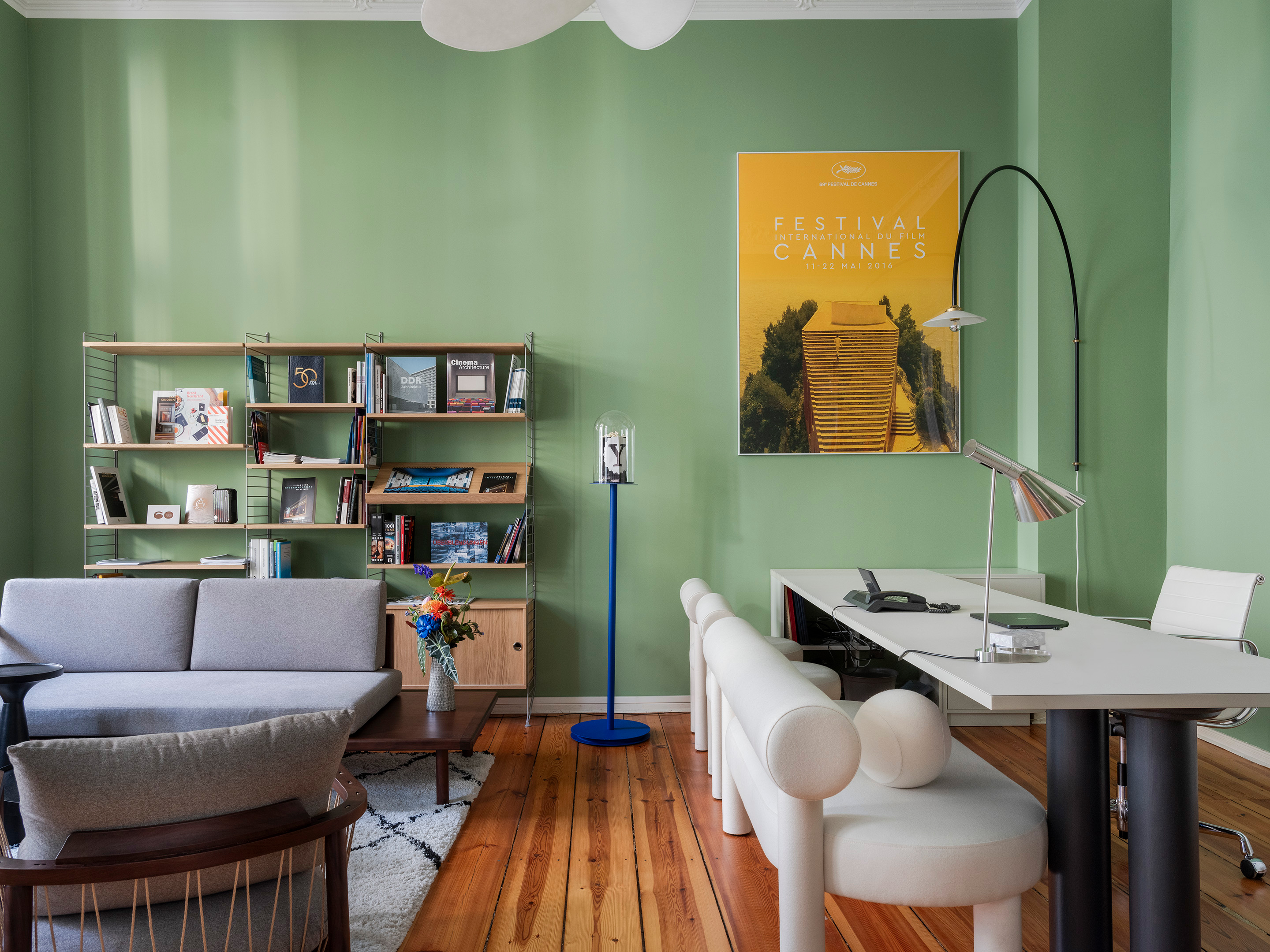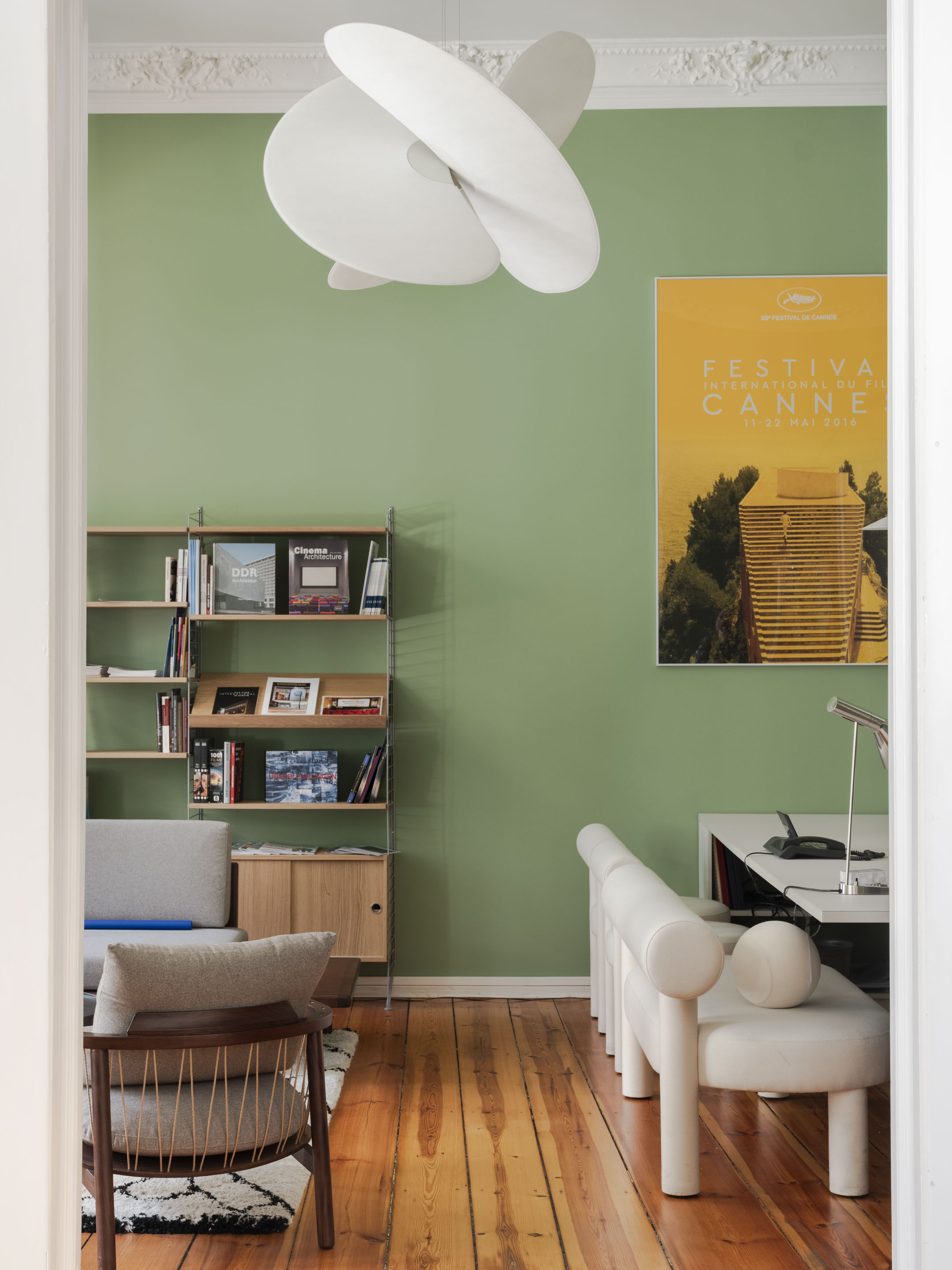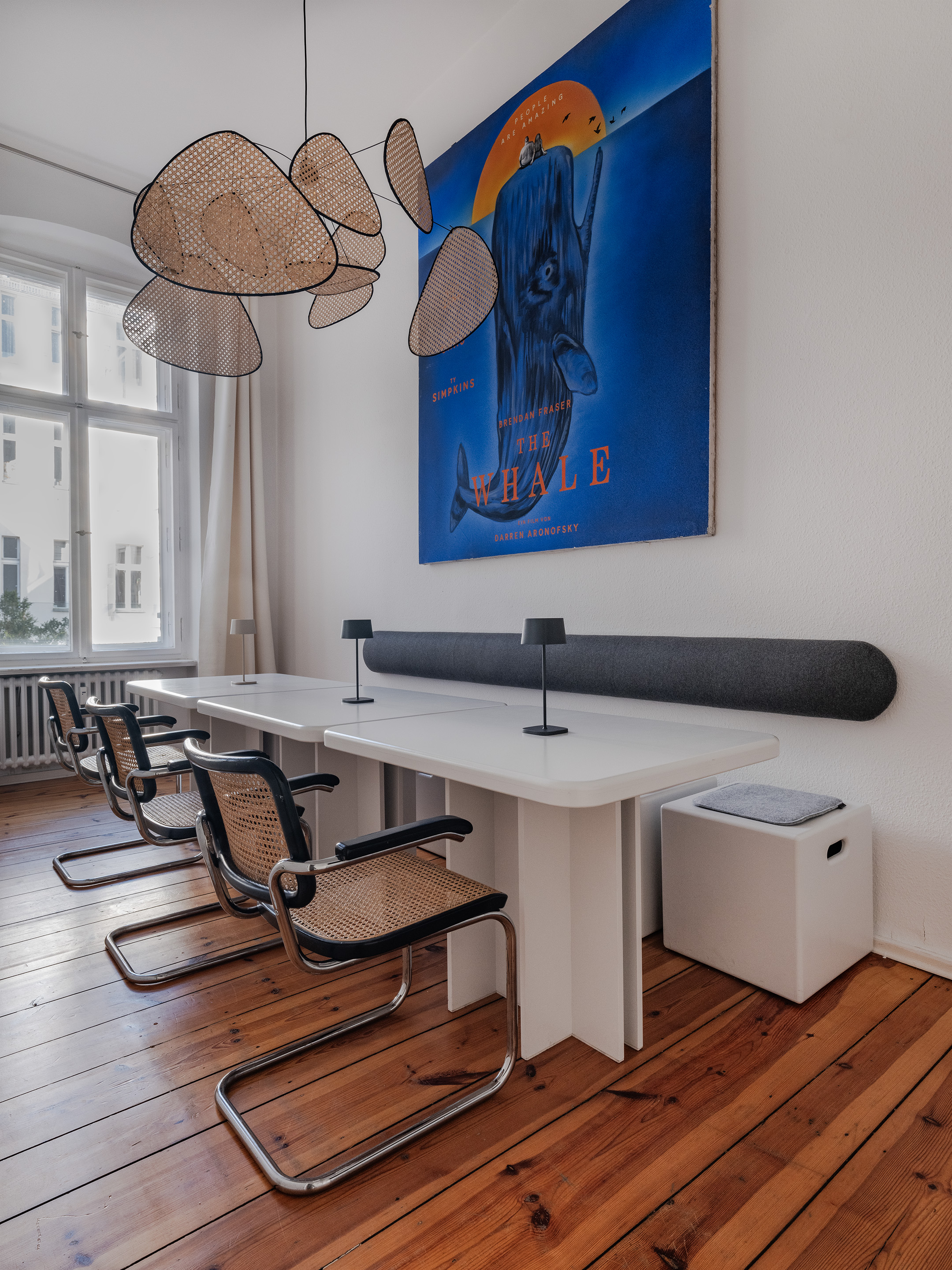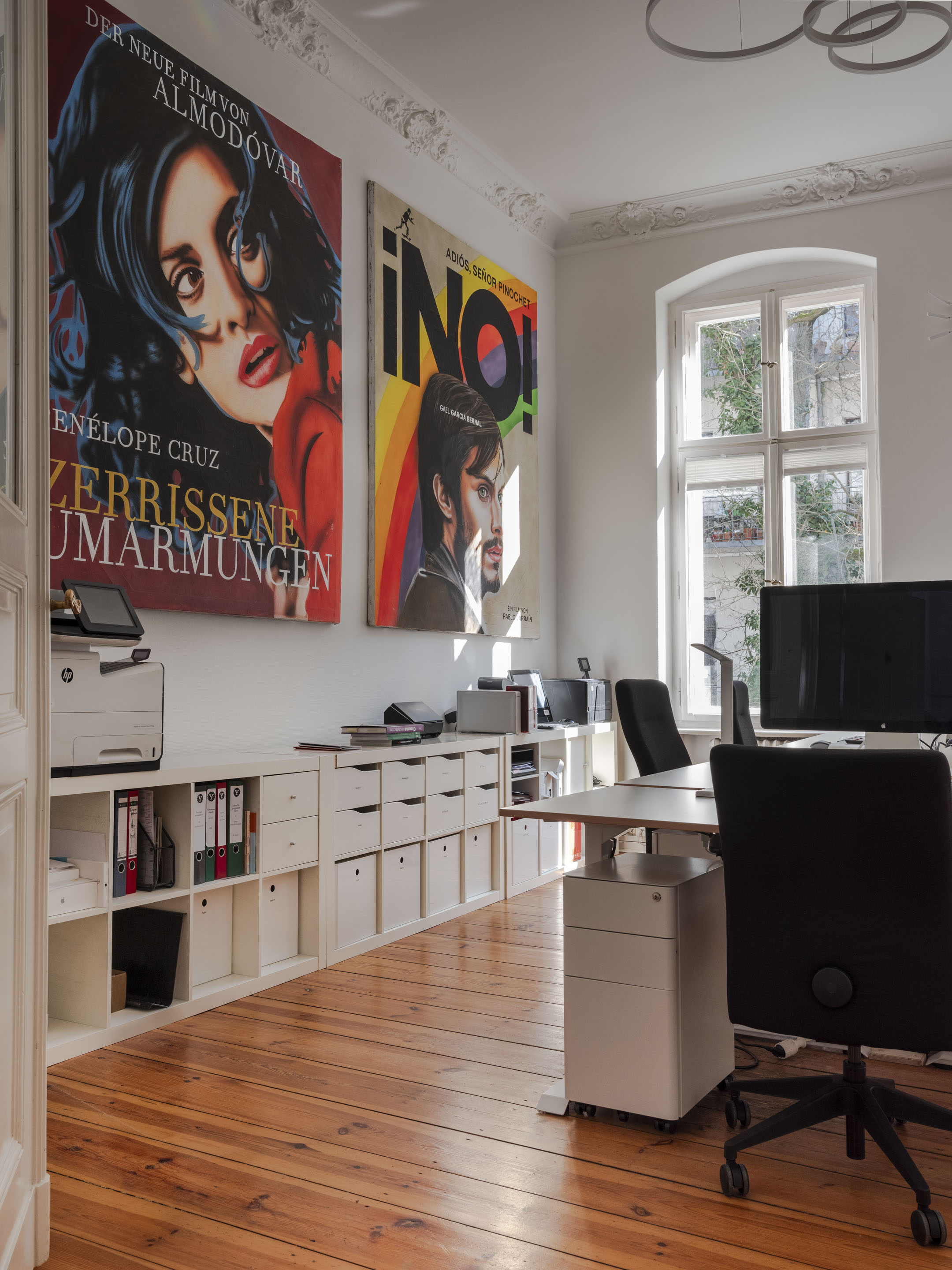 In contrast, the surrounding employees' rooms and meetings' room adiate elegant sophistication. Immaculately white, these spaces provide a clean canvas for the film posters that decorate the walls. These bold painted film posters inject splashes of colour and energy, reflecting the dynamic spirit of Berlin's film scene.