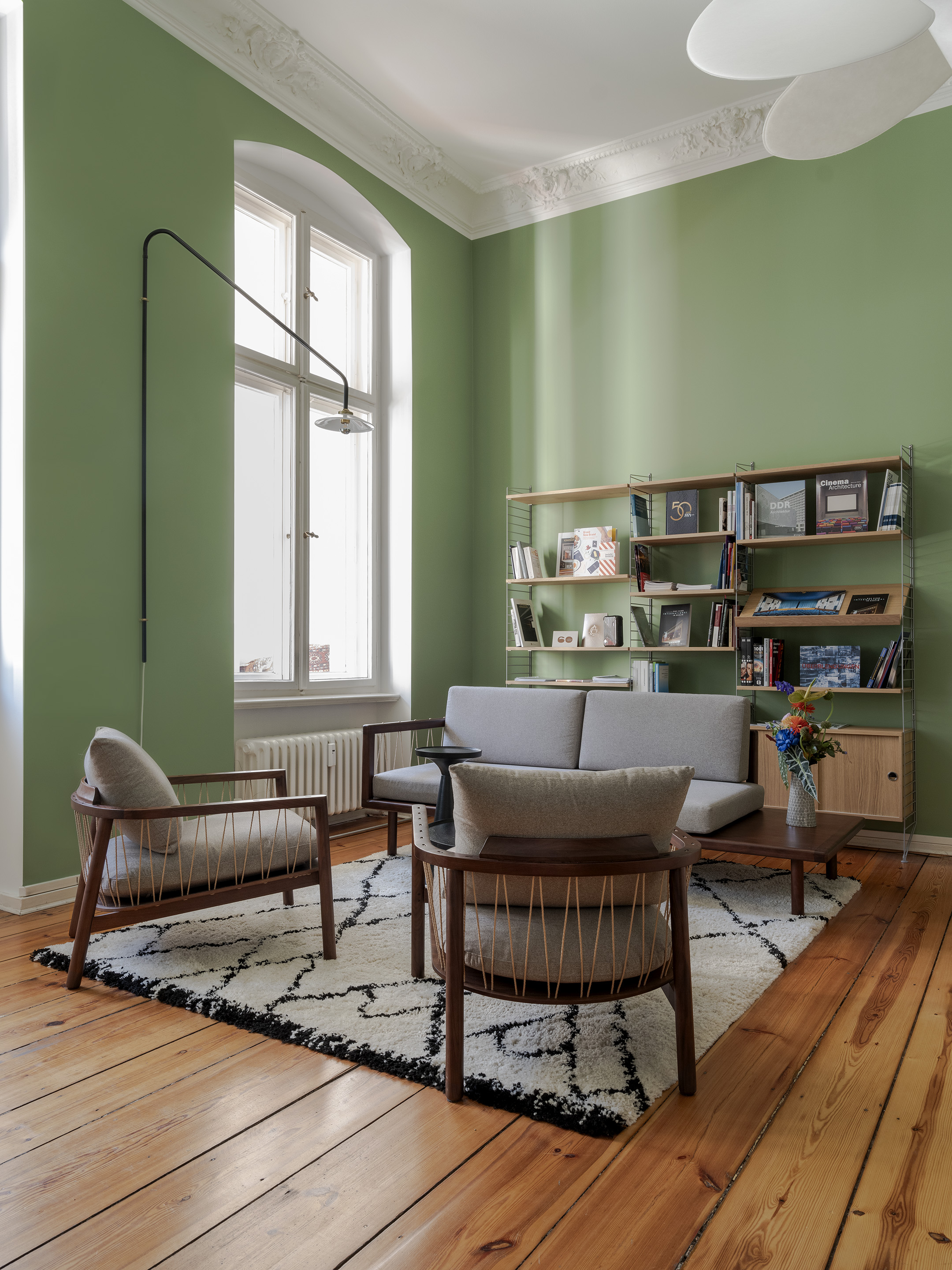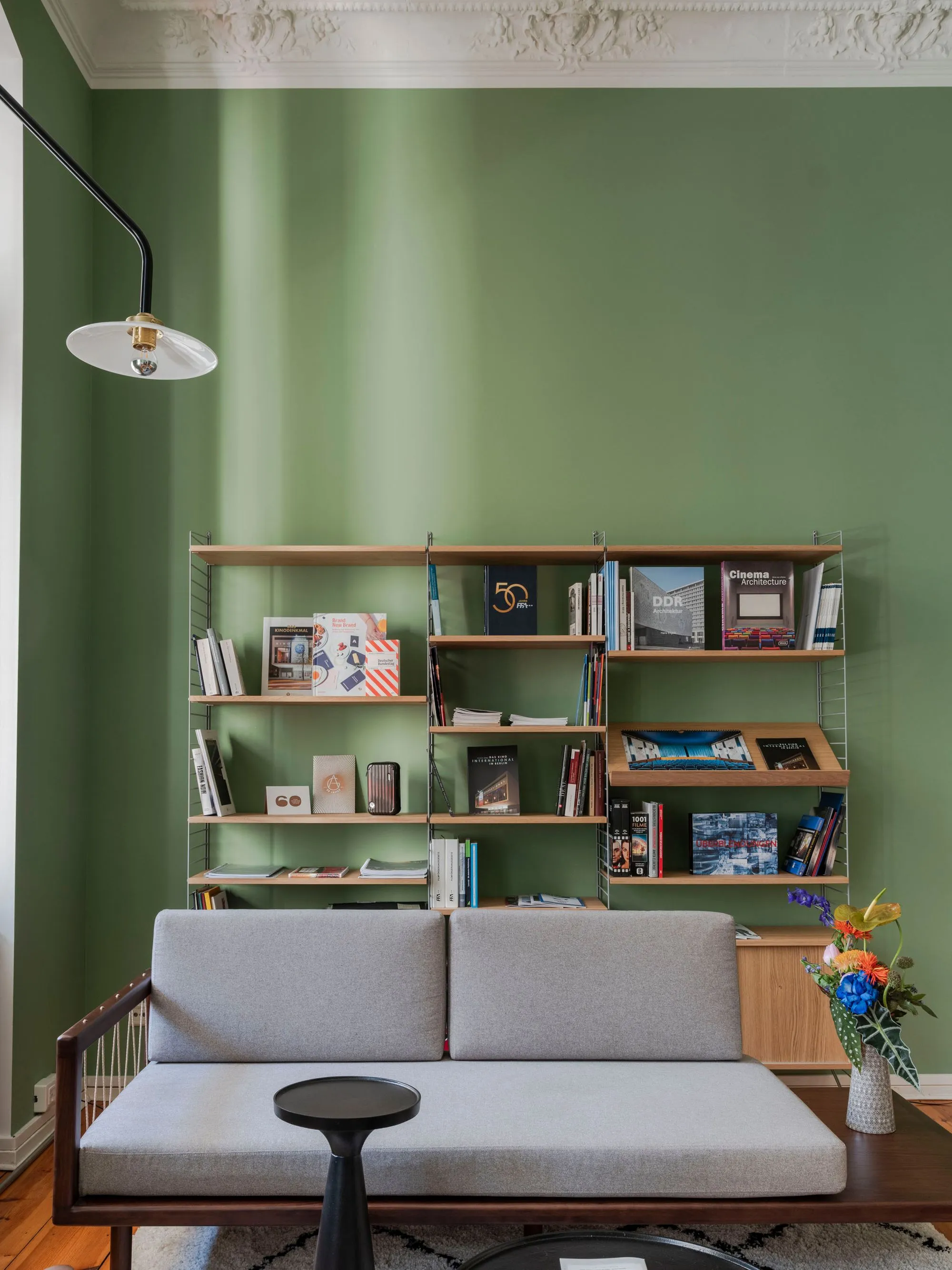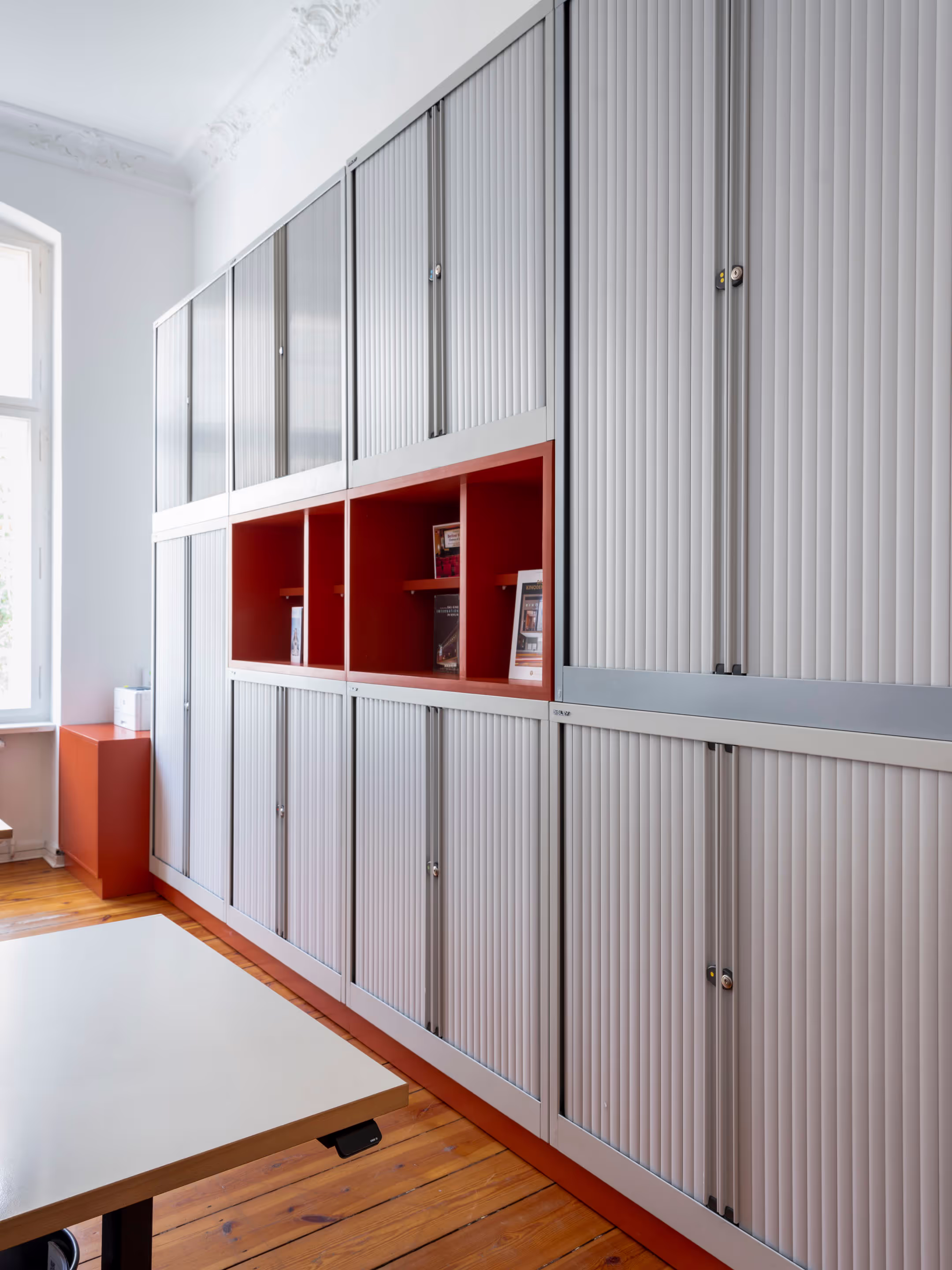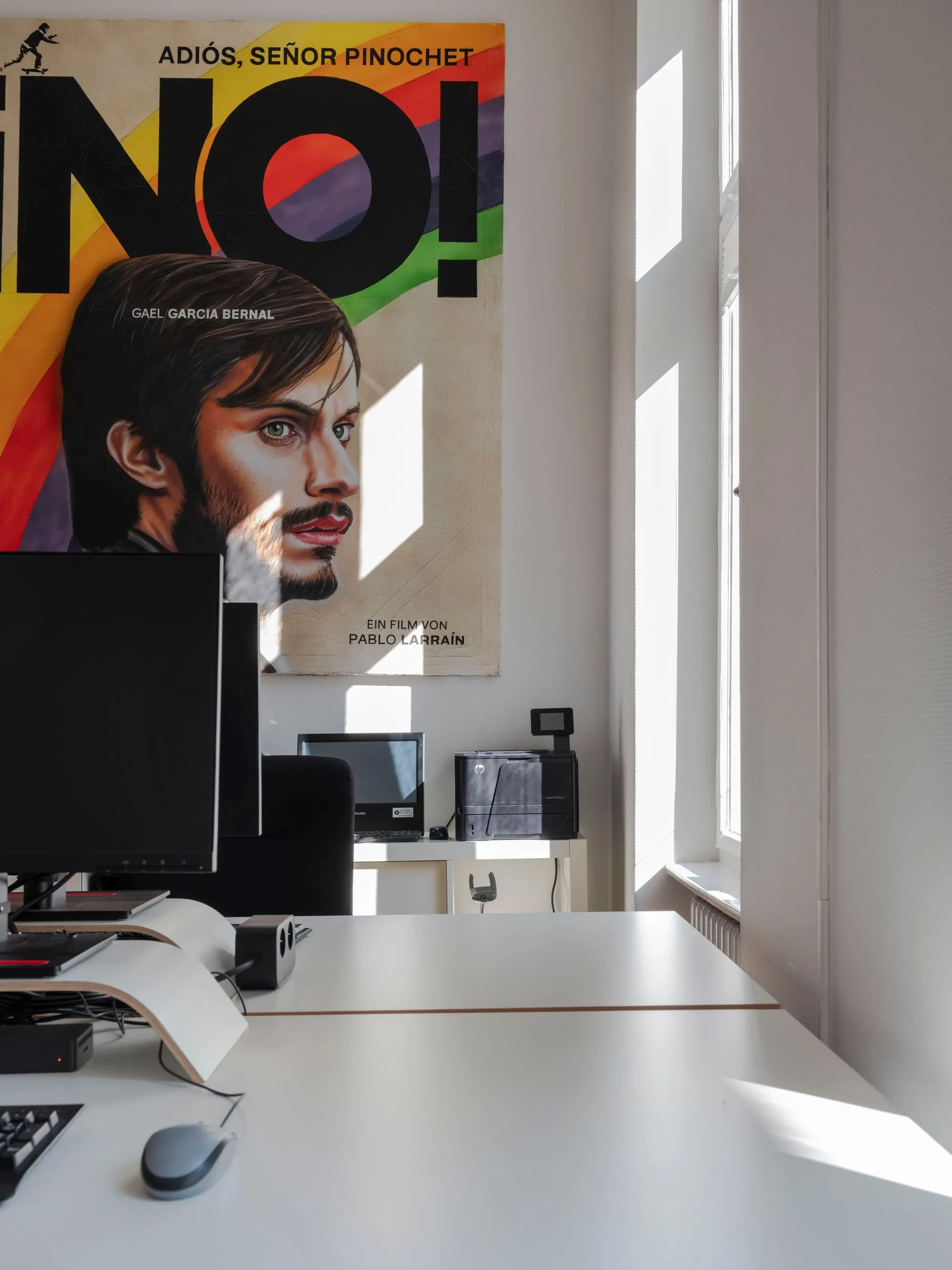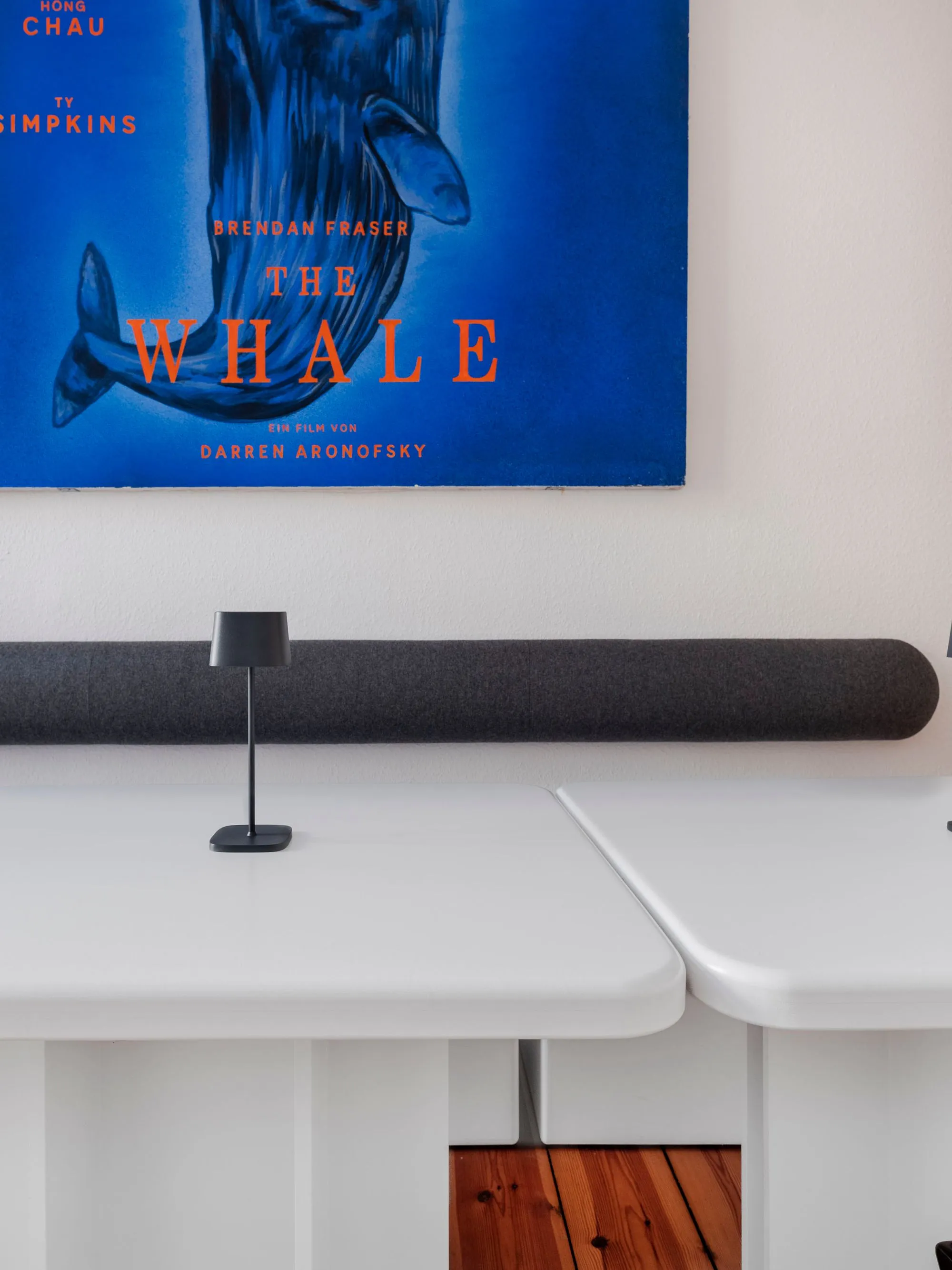 In contrast, the surrounding employees' rooms and meetings' room adiate elegant sophistication. Immaculately white, these spaces provide a clean canvas for the film posters that decorate the walls. These bold painted film posters inject splashes of colour and energy, reflecting the dynamic spirit of Berlin's film scene.