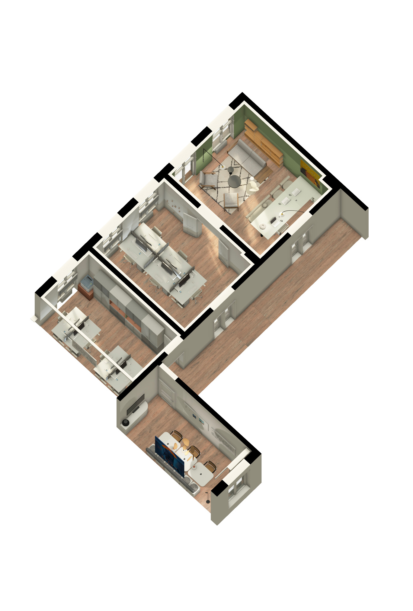 We designed 4 rooms, including 2 coworking rooms for employees, a meeting-room, and the office of the management office.